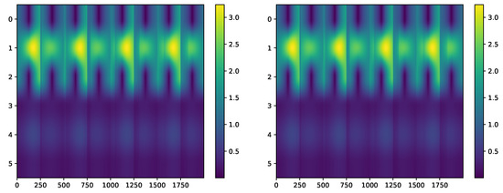 To show the effects of the LS-PIE module on the generated latent spaces, we consider a foundational example f, uniformly sampled at samples per second using Hankelisation with a window length of 300. In turn, Figure 5(right) is a signal with decreasing frequency over time, expressed by .