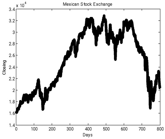 In this work, two time periods were determined in order to evaluate the proposed method. For the first period, 800 data points were used. The data used were from the closing of the MSE and are daily data that correspond to the period from 9 November 2005 to 15 January 2009, where we plot on the x axis the historical data (in this case, the daily data) and on the y axis the closing of the MSE (illustrated in Figure 2). In the experiments, 70% of the data was used for training the ensemble neural network and 30% was used to test the network [34].