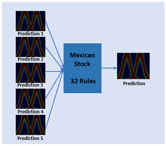The contribution of this work is the design of type-3 fuzzy systems in ENN decision making, as type-3 fuzzy logic could provide a better ability in handling the uncertainty of combining the responses of the modules forming the ENN. In this case, this is done for the prediction of the Mexican stock exchange [34]. A type-3 fuzzy system is proposed as a model for ENN aggregation to enhance time series prediction. In previous work, we worked with type-1 and type-2 fuzzy systems. However, in this work, Mamdani and Sugeno type-3 fuzzy systems are proposed for the first time in this application. The systems are made up of five inputs and one output (called ‘prediction’) with 32 possible fuzzy rules. Also, a type-2 fuzzy system was designed to compare the results and verify whether the type-3 fuzzy systems can obtain better results for time series prediction.