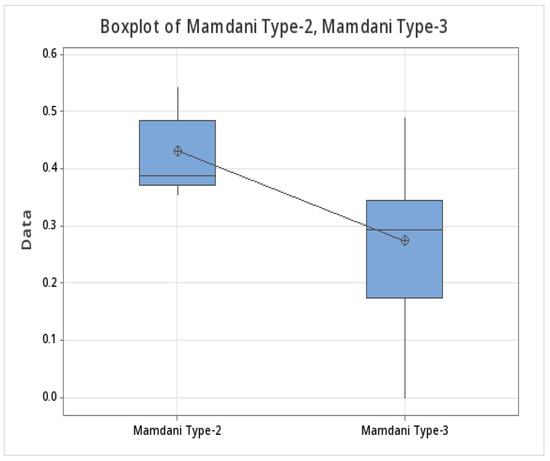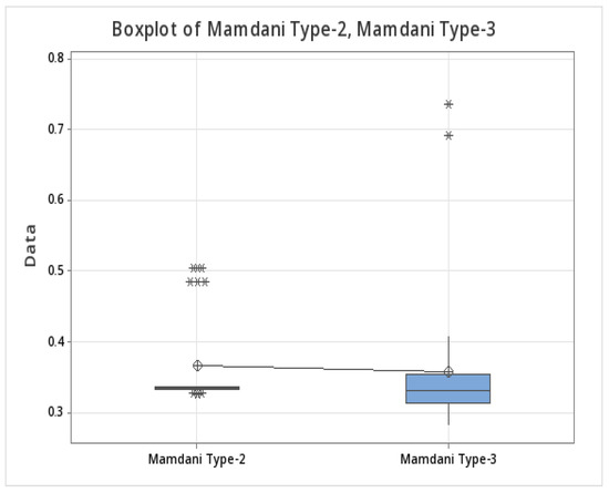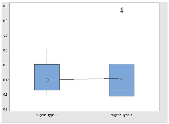 To compare the two fuzzy systems for MSE Series 1, the t statistical test was used. We can conclude that there is a significant difference between the Sugeno type-2 fuzzy system and the type-3 Sugeno fuzzy system. In other words, it can be said that the type-2 Sugeno fuzzy system is slightly better, but not significantly better. The number of samples was 29, and a 95% confidence interval was used. This produced a p value of 0.772 and a T value of −0.29. Table 15 shows the results for the Sugeno type-2 and type-3 systems for the first time period.