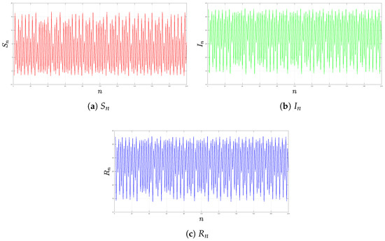 Remark 1. The parameter A typically includes births and immigration/emigration; however, we assume that the net effect of births minus emigration is negligible. Therefore, A mainly reflects the immigration rate. This assumption simplifies our analysis and focuses on the most significant component of population change in the context of our study (see [11]). Applying the forward Euler scheme to model (