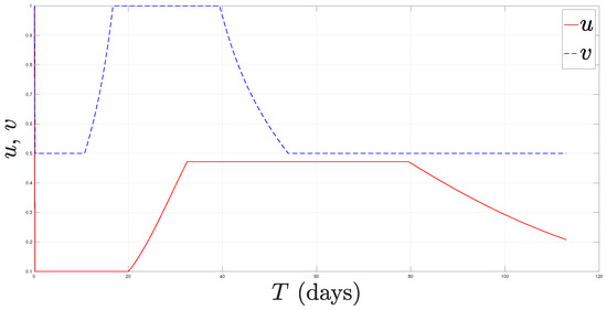 11]. The primary goal of this section is to propose a way to handle this particular type of optimization issue. Two control variables are used to formulate this problem as an optimal control problem (which represents border control and the implementation of non-pharmaceutical intervention (NPI) strategies). In our study, we have concentrated on the values of the control variables