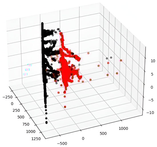 The first three principle components of the Occupancy dataset produced by the PCA algorithm after the data were normalised to have a mean of zero and variance of one in each dimension. The time components of the data were ignored. Points corresponding to the room being unoccupied are coloured black, and occupied rooms are coloured red.