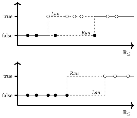 The left and right Kan extensions, and , produced from the functors and , which represent a binary classification dataset over the ordered real numbers. The two graphs show the different extensions produced from a dataset with overlapping classes (upper) and separable classes (lower).