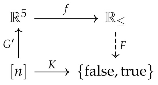 The data analysis identified that the data could be suitably separated with a hyperplane. This can be represented by constraining the trainable portion of the construction to be a linear map into the real numbers . For this construction, is the discrete category, with being the category which represents the ordered set of real numbers. The choice of as the codomain of f is equivalent to stating the belief that the points of can be ordered based on how likely they are to be classified as either “occupied” or “not-occupied”. This means that f uses the ordering of to induce a partial ordering on the points of based on their presumed classification. The role of the Kan extensions in this construction is to decide the cutoff, where points greater than a certain value must be classified as “occupied” and less than that value as “not-occupied”. These choices result in the diagram in Figure 4.