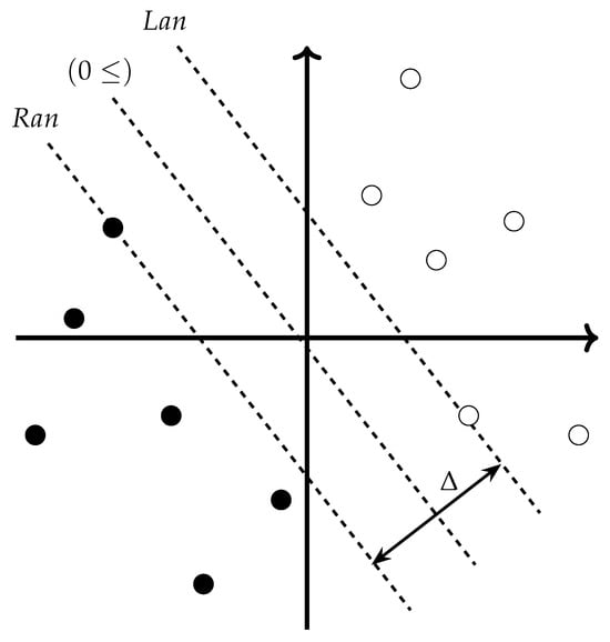 From the construction presented in the previous section, the remaining task is to produce an algorithm which finds a suitable, linear transform, , which maximises the distance () between the decision boundaries produced by the left and right Kan extensions. As f is a linear transform, it can be defined as , where is a five-dimensional real number vector. Applying f to every point of the normalised dataset, can be computed as the difference between the data point with the smallest positive value after f, as well as the data point with the largest negative value after f. For the purposes of classification, the process of normalising the dataset and then transforming with f can be understood as assigning a score to each point based on its signed distance from the hyperplane. This corresponds with the image of the point in (Equation (12)):