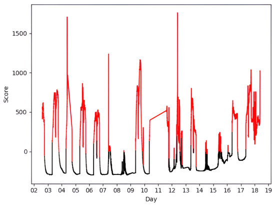 The scores generated by the fitted C-SVM on the Occupancy dataset. Points that are labelled as occupied in the dataset are coloured red, and unoccupied points are coloured black.