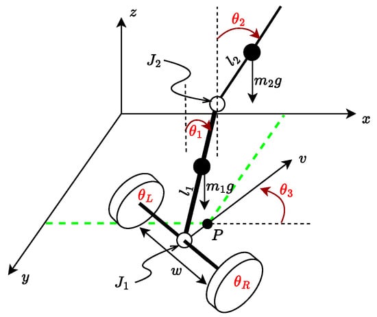 As the balancing platform is essentially a mobile robot with differential traction, movement restrictions arise due to its nonholonomic nature, adding complexity and turning it into a multi-objective problem. Balance must be maintained while following a specific trajectory on the plane, which poses significant challenges in planning and control execution [5]. The literature covers various subjects: hardware, sensing configurations, and control methods for two-wheeled and self-balancing robots [6,7,8]. For instance, the authors in [1] introduced a low-cost prototype with nested control to regulate the longitudinal displacement and speed via the pitch angle. In [9,10], advanced control algorithms are proposed using adaptive sliding mode and direct fuzzy control for improved velocity tracking and stability. The works [11,12] presented a nonlinear control approach, avoiding linearization around the equilibrium points; a machine-learning-based adaptive fuzzy logic-proportional integral controller for variable payloads in a two-wheeled underactuated-mobile inverted pendulum was developed by [13]. Recently, refs. [14,15] proposed a self-balancing robot with PID control using sensors and complementary filters for practical angular velocity estimation and motor stability; the controller was implemented with Arduino. However, to the best of the authors’ knowledge, few works have been dedicated to the study of two-wheeled and self-balancing platforms with a coupled inverted pendulum.