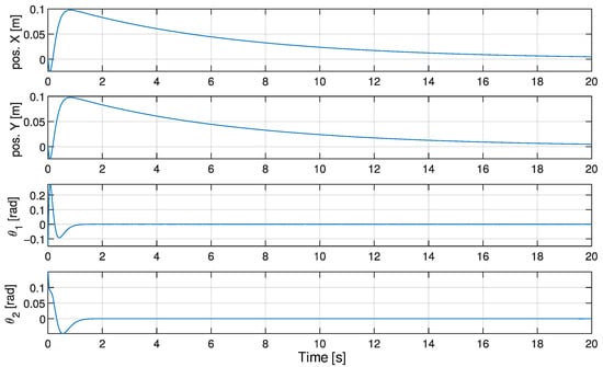 Simulation results illustrate the stabilization of the pendulum from an unstable initial position, and its return to the origin are presented in Figure 3. These simulations operate within the -degree range, consistent with the small-angle approximation. A Gaussian noise signal was also introduced into the control inputs to simulate possible disturbances. As can be seen in the figure, the controllers perform well, keeping the vertical position of the pendulum while maintaining the system at the origin.