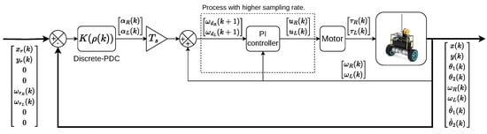 For practical implementation, the speed in each actuator is assumed to be controlled; in our case, the manufacturer provides a tuned PI controller to control the speed in each motor. Figure 4 shows a closed-loop system diagram of the proposal. As the output of the PDC controller is in terms of acceleration (rad/s2) at sampling instant , it is necessary to obtain the reference of velocity for the PI controller. To this end, a dynamic integrator is added. First, the PDC acceleration command is multiplied by the sampling time to obtain the required velocity increment at time in rad/s. This increment is added to the current velocity to obtain the reference velocity at . The PI controller is correctly tuned and uses a considerably smaller sampling period, inserting virtually negligible dynamics into the overall system.
