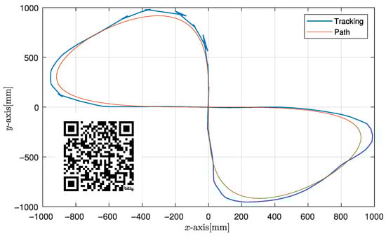 The algorithm has been programmed in the embedded system provided by the manufacturer, which consists of an STM32F103—Arm Cortex-M3 microcontroller. The data have been acquired through Bluetooth serial communication, with a sampling period of 500 ms. A lemniscate trajectory was considered as a reference. Details of how to implement this reference are given in Appendix A.