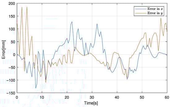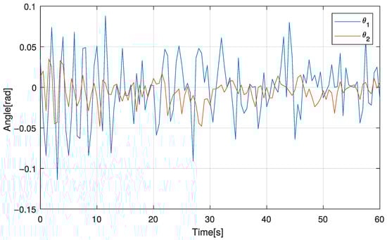 Figure 5 displays the trajectory tracking response, where a slight deviation can be seen in the curves due to the variations in the linear and angular velocities of the path. These deviations show the sensitivity of the system to path accelerations. Figure 6 illustrates the behavior of angles and during the 60 s of testing. In this case, noise is particularly noticeable at , mainly due to the IMU’s low quality and the potentiometer used to measure . However, despite the noise, the maximum deflection peaks remain within the designed values for the small angle approximations.