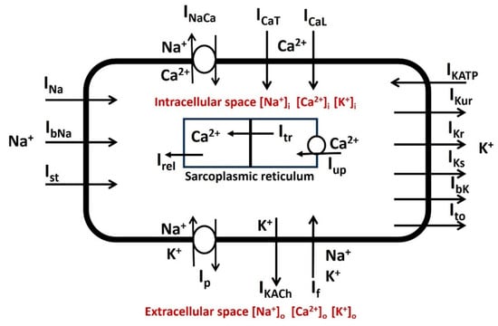 - Varró, A.; Tomek, J.; Nagy, N.; Virág, L.; Passini, E.; Rodriguez, B.; Baczkó, I. Cardiac transmembrane ion channels and action potentials: Cellular physiology and arrhythmogenic behavior. Physiol. Rev. 2021, 101, 1083–1176. [Google Scholar] [CrossRef]