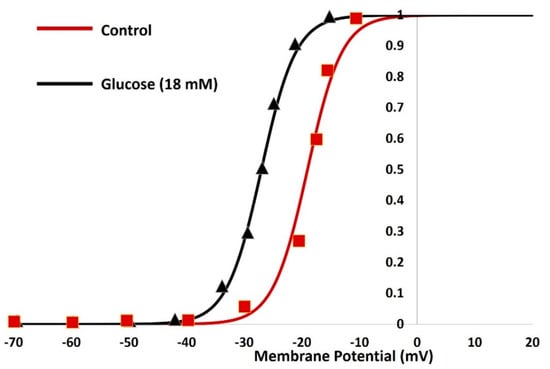 The steady-state activation curve, current-voltage curve, and currents under the voltage-clamp protocol are generated for the voltage-gated sodium channel currents (INav) under both control and application of glucose 18 mM) conditions. The INav is formulated according to the Equations (5)–(7). The HH formalism consists of both activation and inactivation parameters. Active currents were induced by applying a series of +10 mV voltage steps ranging from −70 mV to 50 mV, each lasting 50 ms, starting from a holding potential of −120 mV. This protocol was used to assess the impact of glucose on INav steady-state activation. The peak of each simulated current was recorded. Figure 3 displays the simulated and validated steady-state activation curves for the INav. The red solid line represents the simulated curve from our model under control conditions, while the black solid line depicts the curve with 18 mM glucose application. The half activation potential for both control and 18 mM of glucose are −19.5 mV and −28.7 mV, respectively. The filled red squares and black triangles represent the combined experimental data sourced from Chen 2018 [34]. It also supports that our simulated curve has good matching with the experimental data.