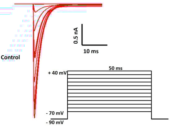 Then, the INav was generated again under the same voltage clamp protocol with the application of 18 mM glucose. The simulated current is shown in Figure 5. When we compare the current amplitude (Y-axis) in Figure 4 and Figure 5, it is clearly illustrated that the glucose concentration reduces the INav significantly.