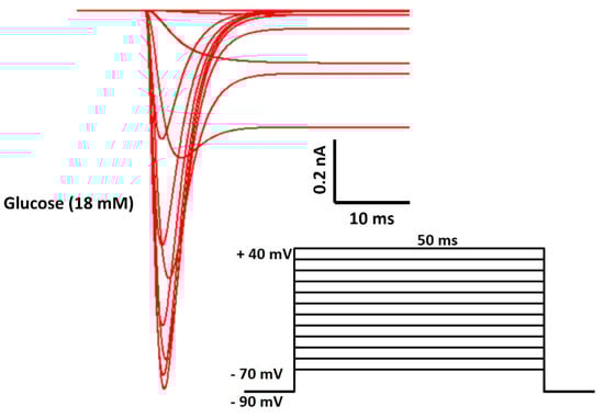 Simulated INav with 18 mM glucose under the voltage clamp protocol. The holding potential was held at −90 mV and the membrane potential increased with 10 mV step voltage from −70 mV to 40 mV.