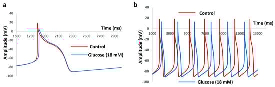 AP simulation under both control and 18 mM glucose concentration. In (a), a single AP was generated by injecting a 3 nA current for 100 ms, and longer stimulation (3 nA current over 11,000 ms), shown in (b), produced a pattern of AP firing that also demonstrated a reduced firing frequency.