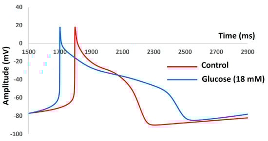 Recent studies have indicated that hyperglycemia influences the activation and inactivation kinetics of various ion channels [61,62,63]. However, the precise relationship between glucose concentration and ion channel current electrophysiology has not been experimentally quantified. In one investigation, Yoshida’s group reported that glucose metabolism regulates voltage-gated K+ channels in pancreatic β-cells, with voltage-gated current modulation observed at glucose concentrations ranging from 2.8 to 16.6 mM [64]. To explore this effect in our model, we normalized the glucose concentration to the K+ channel’s maximum conductance and applied this to an 18 mM glucose concentration. While we anticipated an impact on excitability and APD duration, Figure 8 reveals a significant alteration (extended) in APD (without affecting peak amplitude), likely reducing the AP frequency.