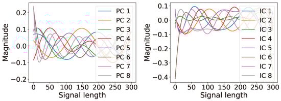uniformly sampled at samples per second using Hankelisation with a window length of 300. The results for extracting eight latent variables using PCA and ICA are shown in Figure 4. Here, we expect identical results for PCA and ICA, merely a single-frequency Fourier sin-cosine decomposition, as shown in Figure 5. Note the improvement in informativeness as latent scaling (LS) is applied. In turn, note the improvement in the informativeness of the latent directions of latent ranking (LR) and enhancement of latent condensing (LC) for ICA. For ICA, LC combines the second- and third-ranked ICs.