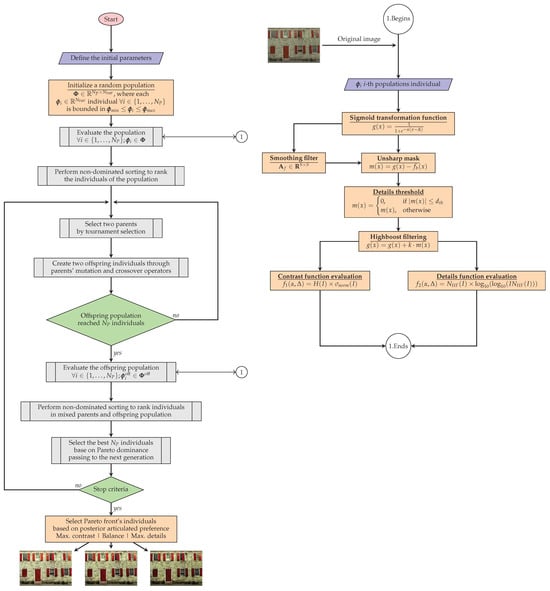 The selection of NSGA-II in this study is based on several algorithm strengths. Firstly, its elitist mechanism ensures the preservation of the best solutions across generations, preventing the loss of optimal solutions. Additionally, the crowding operator used by NSGA-II eliminates the need for sensitive parameters associated with niche techniques, simplifying the implementation process. Furthermore, NSGA-II exhibits low time complexity relative to other multi-objective evolutionary algorithms, which is advantageous for practical applications. It has also demonstrated efficient performance in multi-objective problems involving two objective functions, making it relevant for contrast and detail enhancement tasks. Although other more recent multi-objective evolutionary algorithms have succeeded in generic benchmarks, NSGA-II remains highly competitive in solving real-world problems [
