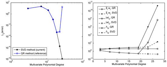 As shown in Figure 4, when increasing the degree of polynomial, the Lebesgue constant of the QR-based algorithm (based on one iteration) increased rapidly and the reconstructed function exhibited unacceptable errors. In contrast, the sum of the absolute values of the weights of the quadratures, i.e., , obtained using the SVD-based formulation monotonically decreased. For both methods, , which shows that the QR-based algorithm generated negative weights with an increased polynomial degree. Additionally, the Lebesgue constant of the SVD method remained smaller than that of the QR method. The same observation held for the norm of the SVD method compared with the QR approach.