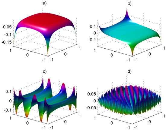 The orthogonal modal basis functions of Equation (22), evaluated on Chebyshev points. (a) ; (b) ; (c) ; (d) last mode, i.e., .