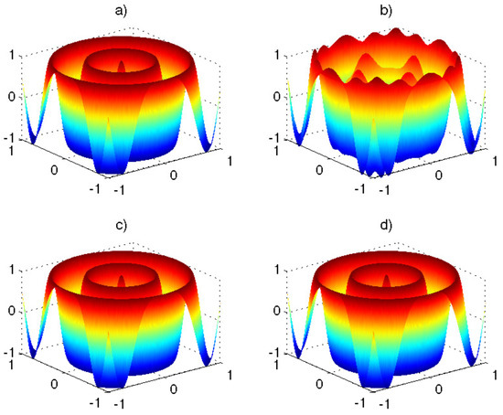 The spectral filtering of in Q-space by eliminating the higher-frequency orthogonal basis Equation (26). (a) , i.e., full rank; (b) , i.e., half rank; (c) , i.e., ninety percent rank; (d) exact.