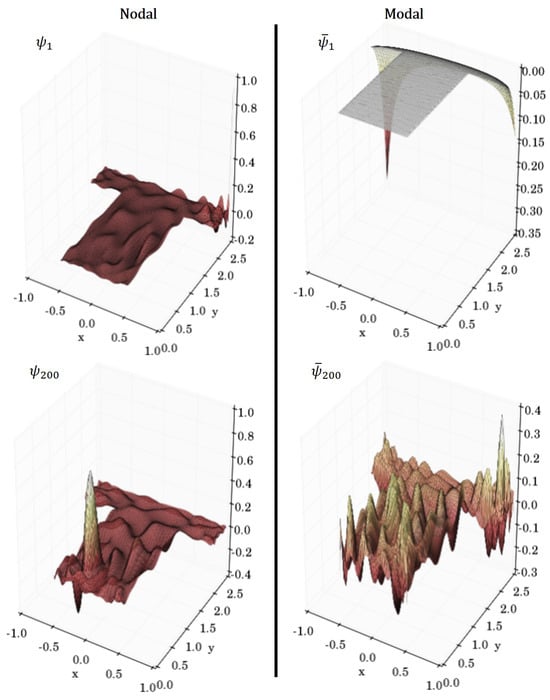 A plot of the nodal basis functions (Equation (21)) for a 16th-order P-space on a T-shaped domain is presented in the left column of Figure 7. In this figure, the top-left plot shows the first nodal basis , and the bottom-left plot depicts the 200th nodal basis . It should be noted that took a value of one at the top-right corner of the T-shaped domain and zero at the other AFPs. The right column of Figure 7 shows the modal basis functions (see Equation (22)) for a 16th-order P-space on a T-shaped domain, where the top plot corresponds to the first modal basis and the bottom plot to the 200th modal basis .