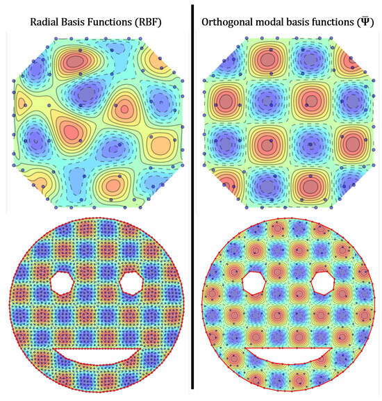 The orthogonal modal basis functions, in addition to being well conditioned, were very accurate compared with the radial basis functions (RBFs) for the same number of DOFs. Figure 8 compares the reconstruction of two wavelengths of sinusoidal functions using an RBF basis (left column) and orthogonal modal basis functions (right column). As can be clearly seen, the RBF was either very inaccurate (top-left) or required many more DOFs to yield accurate results (bottom-left). However, yielded a spectral resolution with the minimum points per wavelength (see the middle of the right smiley-face domain). This resolution was comparable with the Fourier decomposition of the smooth functions on a simple rectangular geometry. These results, which demonstrate the superior accuracy/efficiency of the modal basis functions, can contribute to the field of meshfree methods, where RBF methods are extensively used.