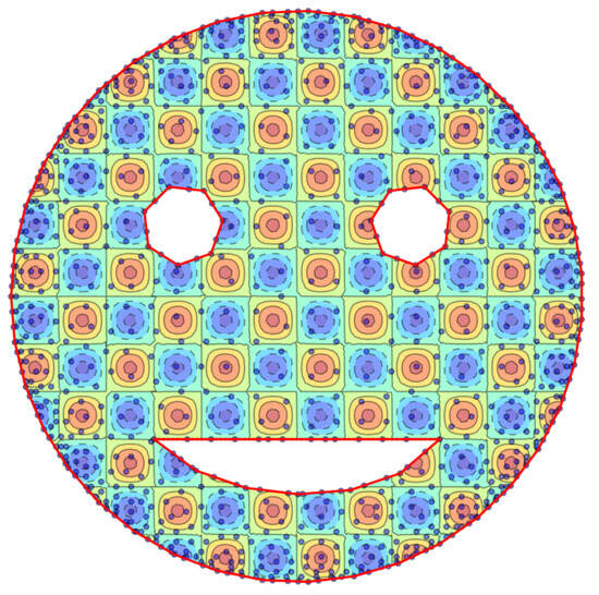 where and are orthonormal matrices and is a diagonal matrix, in which the diagonal elements are the singular values of . It was proved that any matrix has singular values, where . For the initial Vandermonde matrix , since the points are distinct and , the rank is equal to N. Thus, will have N nonzero diagonal values , conventionally sorted in descending order. Since, according to SVD, the best N-degree approximation of can be written based on these rows, one can conclude that the points corresponding to these rows form the best set of size N representing , which are, in fact, AFPs. An example of AFP determination using this approach is shown in Figure 1 for a complex domain including discontinuities. Once the AFPs are determined, we can construct the corresponding Vandermonde matrix . In the rest of this paper, we indicate all the AFP-related quantities as .