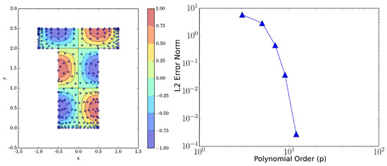 To demonstrate the superlinear convergence of the modal basis functions, a concave T-shaped domain was used to reconstruct the sinusoidal function. The result is presented in Figure 10, where the superlinear (spectral) convergence is shown.