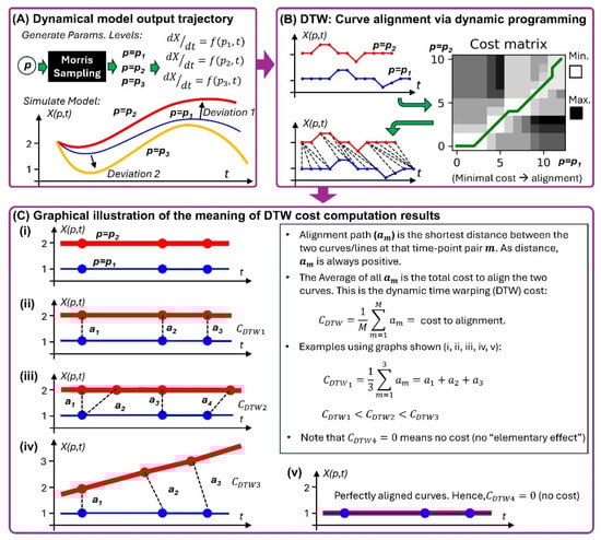 Performing SA on high-dimensional dynamical models has been a challenge due to the functional nature of data, i.e., information is a sequence of data [2]. Handling such functional data during SA has been the focus of numerous studies that can be grouped into two main categories: (1) elementary effects of the coefficients of basis functions [8,9,10], and (2) variance decomposition [10,11]. However, it is computationally prohibitive to apply these prior SA techniques separately on each time-dependent output in high-dimensional dynamical models [12]. This work provides a solution to this challenge by establishing the theory and demonstrating the use of dynamic time warping (DTW) as a metric of elementary effects in Morris-based GSA. Originating in time series analysis, the DTW algorithm measures the similarity between two sequential data by determining their optimal alignment or matching via dynamic programming [13]. The sequences are “warped” non-linearly in the time dimension to determine a measure of their similarity, which is the alignment path with the minimal cost [14]. This makes DTW a fitting technique to be the generalized metric of the Morris GSA for dynamical models that exhibit a range of linear and non-linear effects of the parameters. We propose DTW as an elementary effects metric for Morris-based GSA of high-dimension dynamical models.