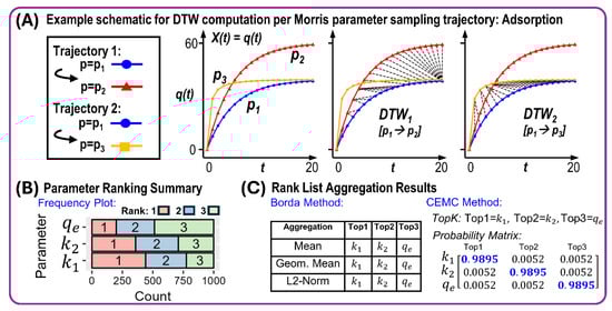 Results in implementing the DTW-based Morris GSA on a single-output dynamics using the example of mixed-order adsorption kinetics: (A) example natural curves from the simulated adsorption kinetics showing sample two trajectories among several trajectories during runs; (B) descriptive summary of the model parameter ranking based in SA index; (C) Borda method and CEMC method rank-aggregation results. First, the Morris sampling approach was applied to create the set of model parameter values that represent the perturbation in the parameter values creating the sampling trajectory such that 1 = [0.2, 0.0, 37.65862069] to 2 = [0.2, 0.0, 57.65862069] perturbation creates the Trajectory 1 and 1 = [0.2, 0.0, 37.65862069] to 3 = [0.2, 0.05655172, 37.65862069] (where i = [1, 2, e]) perturbation creates the Trajectory 2 as shown in (A). Then, the model is simulated using these model parameter values and the DTW alignment cost is computed for each pair of curves in a trajectory, and the graphics in (A) show the DTW1 as alignment cost for Trajectory 1 and DTW2 as alignment cost for Trajectory 2. The DTW alignment cost for each trajectory was then used to compute the elementary effects, as shown in the DTW-based Morris GSA equations above, and the resulting GSA index values were used to rank the model parameters, with Rank 1 assigned to the parameter with highest GSA index. Finally, the parameter rankings were analyzed graphically as shown in (B) and aggregated using rank-aggregation methods Borda and CEMC as shown in (C).