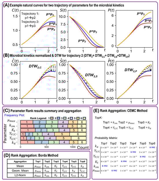 Results in implementing the DTW-based Morris GSA on a multiple-output dynamics using the example of microbial growth kinetics. (A) Example natural curves from the simulated Monod-type microbial kinetics with color lines blue for 1, red for 2, and yellow for 3. (B) Example of the normalized model outputs annotated with the optimally aligned path for each trajectory. (C) Descriptive summary of the model parameter ranking based in SA index. (D) Borda method rank-aggregation results. (E) CEMC rank-aggregation results with highlights in blue color for the highest probability value per TopK rank.