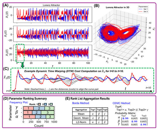 Results in implementing the DTW-based Morris GSA on a set of chaotic solutions using the example for the Lorenz Attractor. (A) Example natural curves from the simulated Lorenz Attractor. (B) Three-dimensional rendering of the model outputs. (C) Normalized curves prior to computation of DTW alignment cost. (D) Descriptive summary of the model parameter ranking based in SA index. (E) Borda method and CEMC method rank-aggregation results.