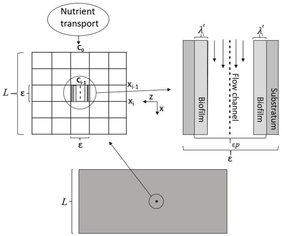 21], it was proposed to model biofilm accumulation in porous media by dividing the 1D domain into several compartments and to consider a series of 1D biofilm reactors, similar in approach to a gradostat model. This is also the point of departure for our model development. Like [