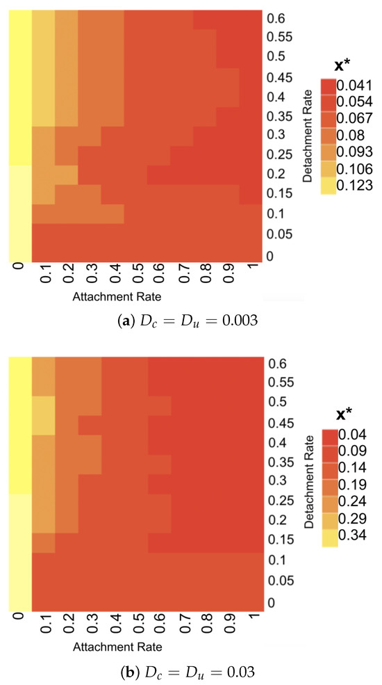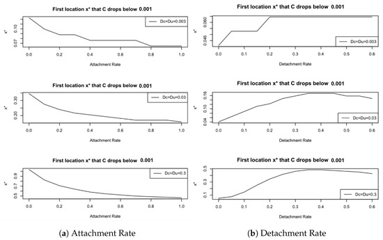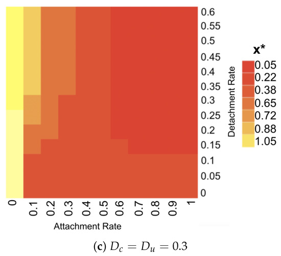 The role of attachment and detachment with diffusion was then studied, where, at least in the parameter range that we probed, attachment had more of an impact on substrate limitation than detachment. This becomes more pronounced as the diffusion coefficient is increased.