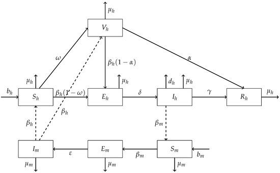 The population of susceptible mosquitoes increases with birth at a rate and decreases with infection after contact with infected humans at a rate and natural death at a rate . The exposed population of mosquitoes is generated by contact of susceptible mosquitoes with infected humans at a rate and decreased by natural death at a rate and by progression into the infected class at a rate . The infected population of mosquitoes is generated through the progression of exposed mosquitoes at a rate and decreased by natural death at a rate .
