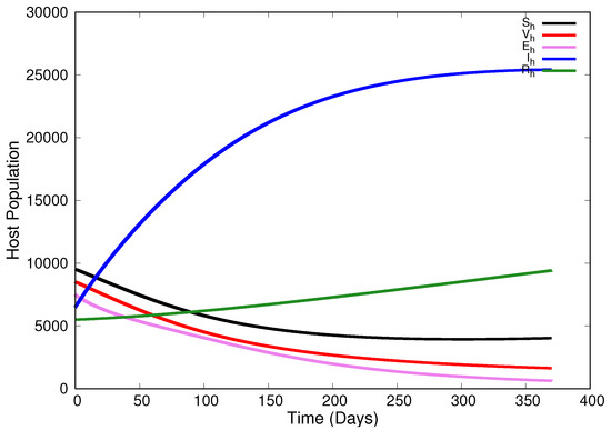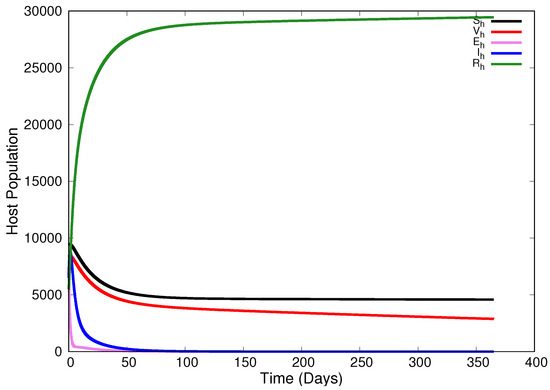 Figure 2 and Figure 3 depict the behavior profiles of state variables for both host and vector populations when there are no malaria infections present. It is evident from these figures that the malaria infection model system converges to a malaria-free state. Despite the influx of susceptible humans and vectors into the population, the susceptible curves gradually decline and approach a certain threshold level, even with relatively high vaccination rates and a proportion () of vaccinated individuals acquiring complete immunity. However, the populations of infected hosts and vectors steadily diminish over time, eventually reaching zero.