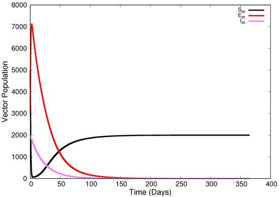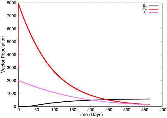 where is the initial condition of the variables in the mosquito population of the model system. Hence, if , then the mosquito population at time t is bounded above by . On the other hand, if , then the total mosquito population will decrease and later approach asymptotically. Hence, the region is positively invariant and attracts with respect to the model system.