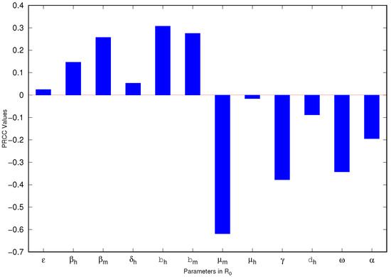 In this section, we describe how we conducted a sensitivity analysis to determine the relative influence of each parameter on the basic reproduction number, . We derived both analytic and numerical results for the various parameters in . Analytic expressions provide insights into potential strategies to mitigate the spread of drug abuse, assuming that the system dynamics adhere to the model (1). The spread of malaria within a population is fundamentally related to the basic reproduction number, which serves as a key threshold to determine the potential for transmission. To better understand how each parameter affects , sensitivity indices were computed. The partial rank correlation coefficient (PRCC), a widely used technique to examine the correlation between individual parameters and the model output while controlling for other variables, was employed. A positive PRCC value indicates that increasing the parameter leads to an increase in , whereas a negative value suggests that increasing the parameter results in a decrease in . These indices quantify the relative impact of changes in individual parameters on , helping to identify the most critical factors driving the onset and persistence of drug abuse. Latin Hypercube Sampling (LHS) was employed to generate an efficient sample of parameter values across their respective ranges, reducing bias and ensuring that all regions of the parameter space were equally represented. This sampling method is particularly useful for complex models with multiple parameters as it ensures a comprehensive exploration of parameter interactions while requiring fewer simulations compared to random sampling. We generated 700 parameter sets using LHS, which allowed us to calculate for each combination of parameters. By combining LHS with the PRCC, we obtained reliable estimates of the influence of the parameters on and identified the key factors driving the transmission dynamics. The normalized sensitivity indices of the model are as follows: