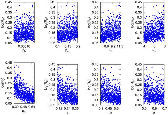 The scatter plots in Figure 7 provide valuable insights into the sensitivity of to different epidemiological parameters. The transmission rates (, ) and mosquito-related parameters (, ) demonstrate a strong positive influence on , highlighting the importance of vector control measures. On the other hand, the human recovery rate () and vaccination parameters (, ) show negative associations with , emphasizing the need for effective treatment and immunization strategies.