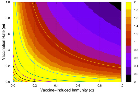 The basic reproduction number () represents the average number of secondary infections generated by a single infected individual in a completely susceptible population. In epidemiology, the primary goal is to reduce to below 1, indicating a condition where malaria infection can diminish within the population. Otherwise, the infection will persist and continue to spread. Contour plots were used to identify effective mitigation strategies or combinations of measures to achieve . Figure 8 illustrates the malaria model’s reproduction number as a function of two important parameters: the vaccination rate () and the vaccine-induced efficacy rate , as observed in Section 6.2. In a contour plot, each contour line represents a constant value of , showing how it varies across different parameter combinations. Closer contour lines indicate rapid changes in with small parameter perturbations, while farther contour lines indicate more gradual changes.