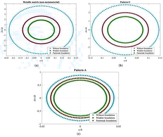 Depicted in Figure 3 are the phase plots of the beam (the centre point) subject to a harmonic force for (a) a metallic matrix (non-metamaterial), (b) a metamaterial with Pattern-U, and (c) a metamaterial with Pattern-A; each panel displays three phase plots: namely, with no foundation (KW = KP = 0.0), with a Winkler foundation (KW = 10.0, KP = 0.0), and with a Pasternak foundation (KW = 10.0, KP = 1.0). The results show that the addition of the elastic foundations, specifically the Winkler and Pasternak types, reduces the transverse deflection compared to the case without any foundation. This reduction occurs because the elastic foundations provide additional stiffness and resistance to deformation, effectively suppressing larger deflections. This phenomenon aligns with the theoretical predictions, where the elastic foundation parameters enhance the beam’s rigidity, thereby suppressing deflections under harmonic loading. The maximum deflection difference between the no-foundation and Winkler-foundation (panel (a)) cases is larger than those of the metamaterial ones (panels (b) and (c)). Comparing panels (b) and (c), i.e., the metamaterial cases, highlights that the effect of the Winkler foundation on the maximum deflection for Pattern-U is larger (when compared to Pattern-A).