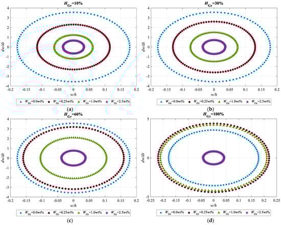 Figure 5 shows the phase diagrams plotted for various graphene weight fractions (WGr) for different values of the graphene folding degree (HGr): (a) HGr = 10%, (b) HGr = 30%, (c) HGr = 60%, and (d) HGr = 100%. For smaller values of the graphene folding degree (HGr ≤ 60%), in general, the transverse deflection decreases as the graphene weight fraction increases. However, in panel (d), where the folding degree is HGr = 100%, the normalised transverse deflection initially increases with WGr, reaching a maximum at WGr = 0.25 wt%, before decreasing at higher weight fractions, as seen by the closed-loop trajectories. This behaviour suggests an optimal graphene weight fraction at which the transverse deflection is maximised, likely due to the interplay between the material stiffness and flexibility, where the concentration of graphene initially enhances flexibility, leading to larger deflections, while higher concentrations lead to an increased stiffness, reducing the deflection amplitude.