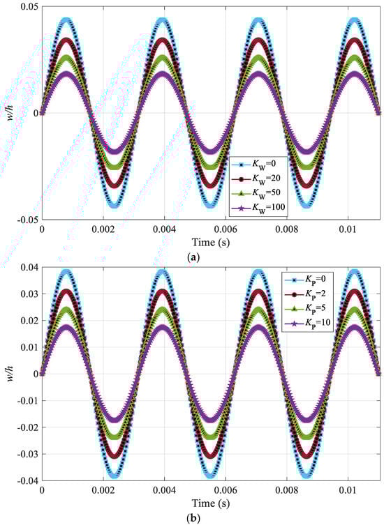 Depicted in Figure 6 are the time history responses of the graphene origami-enabled auxetic metamaterial beam, illustrating the influences of the two-parameter elastic foundation coefficients on its forced dynamic behaviour. Panel (a) presents the normalised transverse deflection of the beam versus the linear layer stiffness (KW). The results indicate that increasing the linear layer stiffness generally reduces the normalised transverse vibration amplitude. Panel (b) shows the normalised transverse deflection against the shear layer stiffness (KP), with KW fixed at 10. Similarly, the normalised transverse deflection decreases as the shear layer stiffness increases.