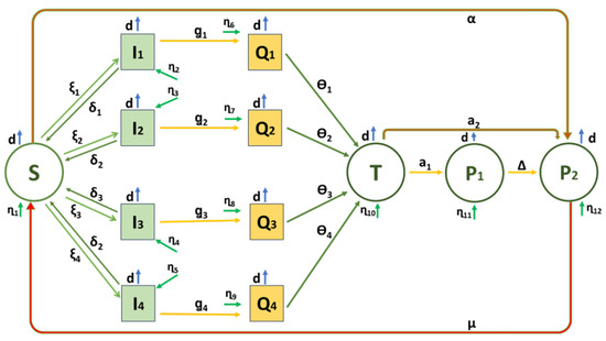 which may be found by concurrently solving the set of Equation (11). Discussions on the stability of the proposed model with regard to equilibrium points are particularly problematic because of its significantly higher dimension. As a result, we shall examine the stability analysis using as the basic reproduction number of model given by (1), approached through the next-generation matrix technique [21].