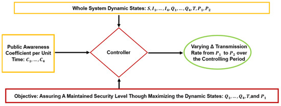 where is the public awareness coefficient of tracing servers per unit time, is the public awareness coefficient of isolated servers per unit time, is the public awareness coefficient of semi-protected servers per unit time, and is the awareness coefficient of semi-protected servers due to heavy infections, and the total maintained security level is symbolized by . The controller objective framework is as indicated in Figure 2.