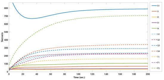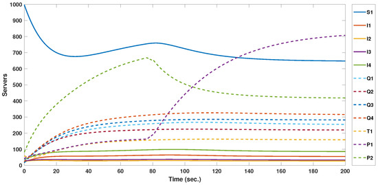 The twelve dynamic states of the network that were produced by first simulating the deterministic MMCE model without taking any control into account are shown in Figure 3. It is clear that susceptible servers are presenting the higher core of total servers with a settling value 789, which means that a lot of servers will be at risk of exposure to infection. Following that, the protected servers have a settling value of about 700 servers. The four infected servers’ categories—healthcare, educational, financial, and media servers—had settling values of 69, 30, 40, and 107, respectively, while the isolated servers of the same four categories had settling values of 240, 229, 292, and 341, respectively. The traced, semi-protected, and protected servers of all categories settled at 162, 222, and 706, respectively. The deterministic controlled MMCE model results are as shown in Figure 4. The susceptible server numbers decreased to a settling value 648 with a reduction of 18%. The four infected servers’ categories settling values reduced to 55, 27, 33, and 85, with a total reduction of 20%, while the isolated servers of the same four categories had reduced settling values of 254, 220, 281, 315, with a total reduction of 3%. The traced servers had a value of 159, with a reduction of 2%. The semi-protected servers of the four categories increased significantly, by 263%, reaching a settling value of 807 servers. So, the controller action succeeded in increasing the total number of servers in the traced, isolated, and semi-protected states and decreased the total number of servers in the susceptible and infected states.