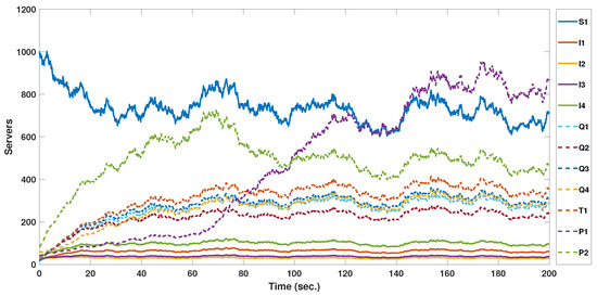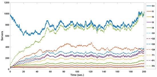 The deterministic MMCE model and Stochastic MMCE are numerically simulated using Euler and Euler–Maruyama schemes, respectively. The used time step takes the value 0.02, and the initial assumed values of the twelve dynamic servers states take the values 1000, 20, 25, 27, 35, 30, 18, 15, 23, 60, 40, and 80 for both suggested models, while the transmission rates , , , , , , , , , , , , , , , , , , , , , , , , , , , , , , , , , d, and take the values 15, 5, 4, 3, 6, 7, 8, 10, 9, 3, 5, 8, 0.00013, 0.00012, 0.0001, 0.0001, 0.05, 0.05, 0.05, 0.05, 0.1, 0.15, 0.08, 0.06, 0.0244, 0.03, 0.02, 0.02, 0.1, 0.05, 0.07, 0.0365, 0.015, 0.025, and 0.035. These parameters values are obtained through trial-and-error techniques to visualize the models’ behaviors. MATLAB software version 2021a is used to run all simulations.